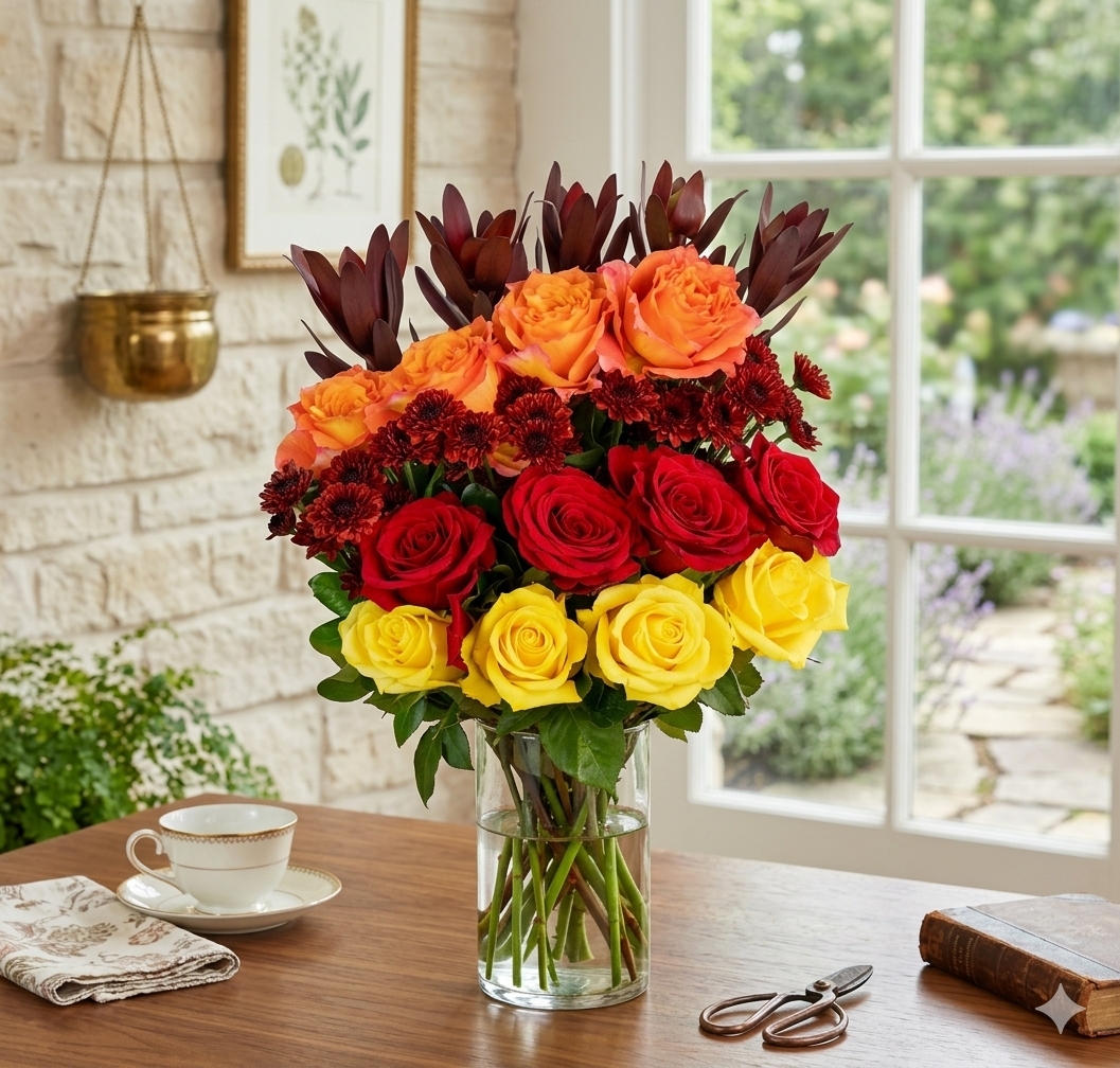 The freshness of amber breeze will enlighten your day. These selections of fine blooms: green pittosporum, safari sunset, free spirit, yellow roses, and red roses.