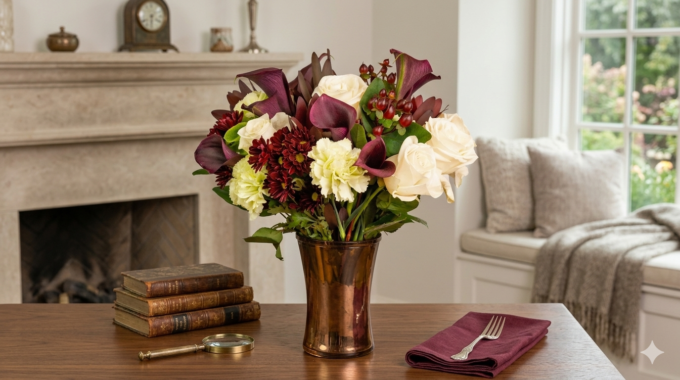 Bringing the essence of love to that special someone, is all the need to know how special they are!! These grogeous blooms bouquets have calla lillies, Vendela roses, green carnations, burgundy hypericum, red pom pon daisy.