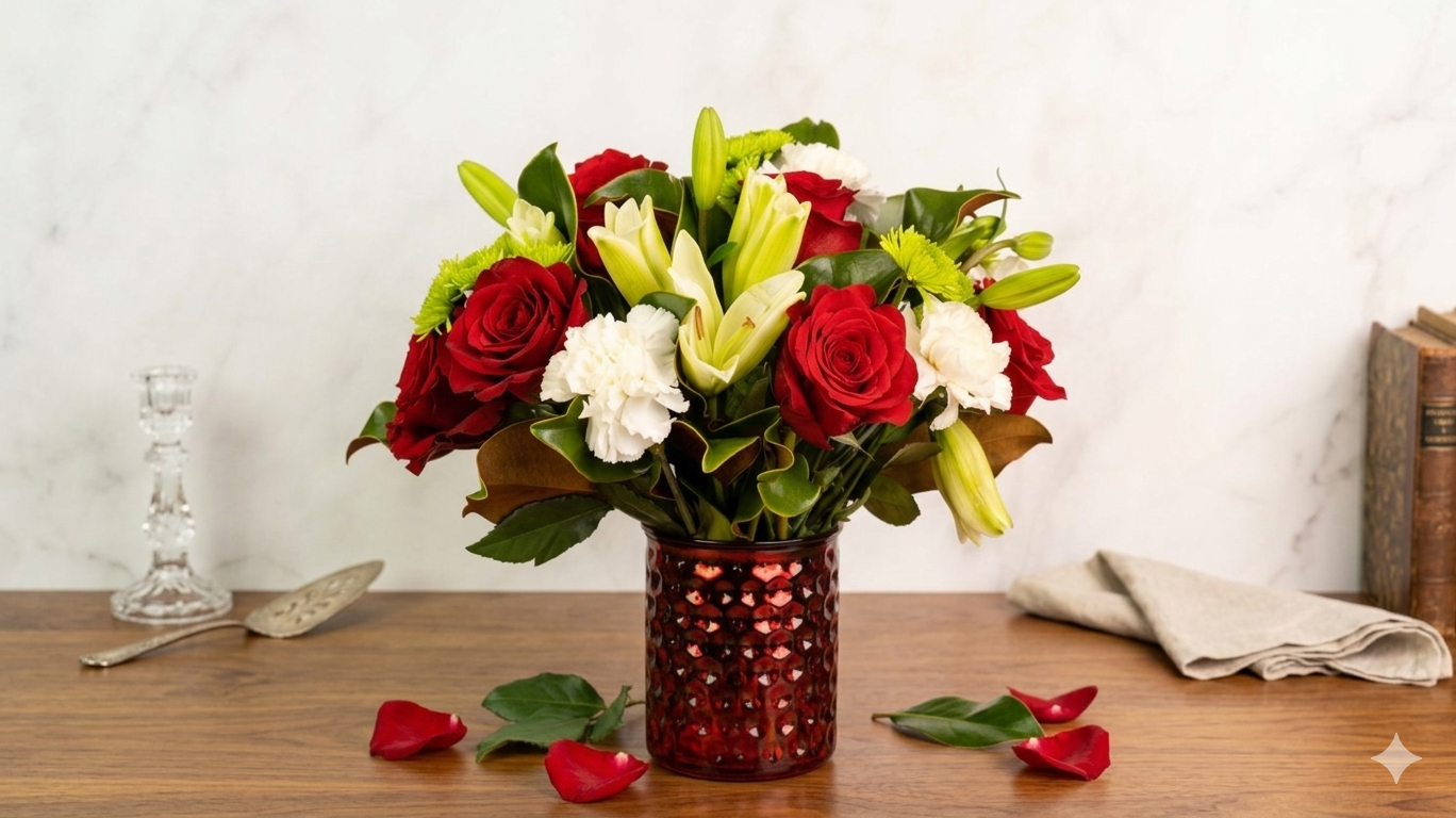 You just got to love this beautiful Garden of Love showcasing ine selected blooms of red roses, white carnations, white lilies, green buttons, magnolia leaf and pittosporum variegated.