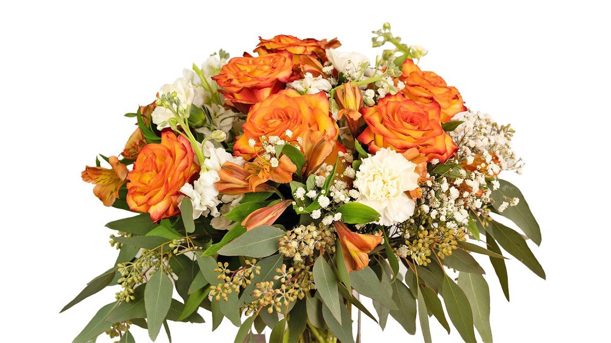 Sweet ambience comes in fine selections of seeded eucalyptus, high magic roses, orange alstroemeria, gypsophila, white carnations, and white stocks.